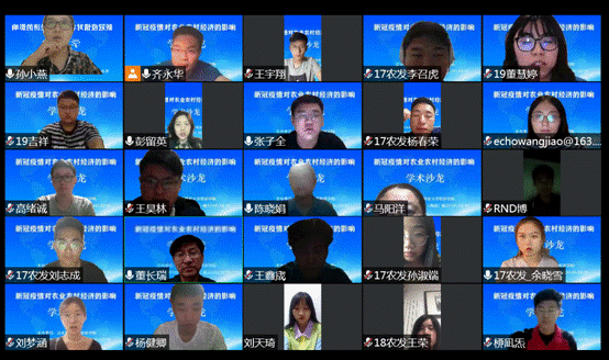 农村区域发展专业和乡村振兴创新实验班的同学踊跃发言,积极参与讨论,现场气氛热烈。会上先后有18位同学分别就疫情下的畜禽养殖、果蔬种植、农民务工、农产品出口、农产品营销、乡村旅游、观光农业、转基因产业等议题作报告。