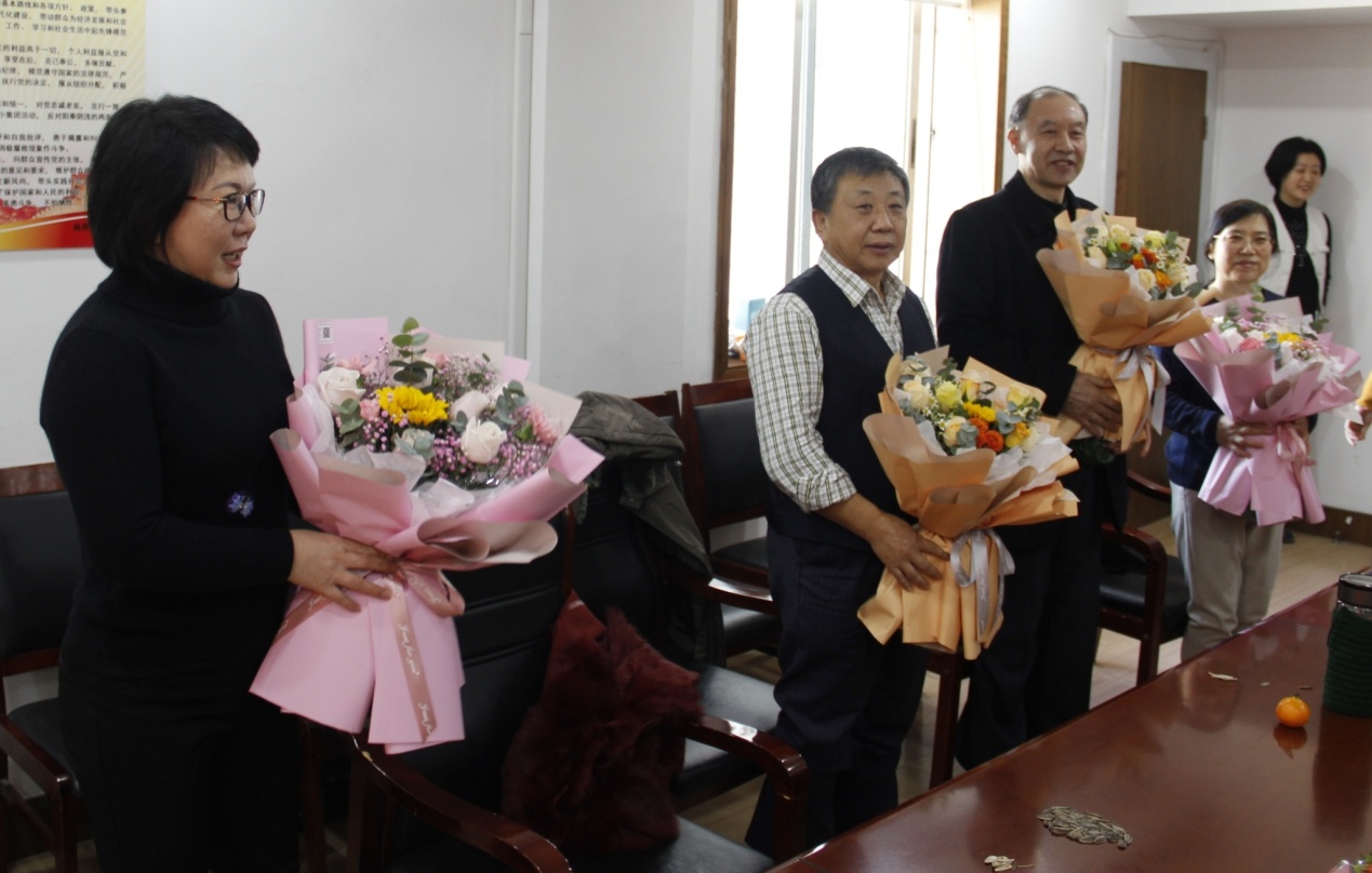 年轻教师代表为荣休教师献上美丽的鲜花以表敬意。