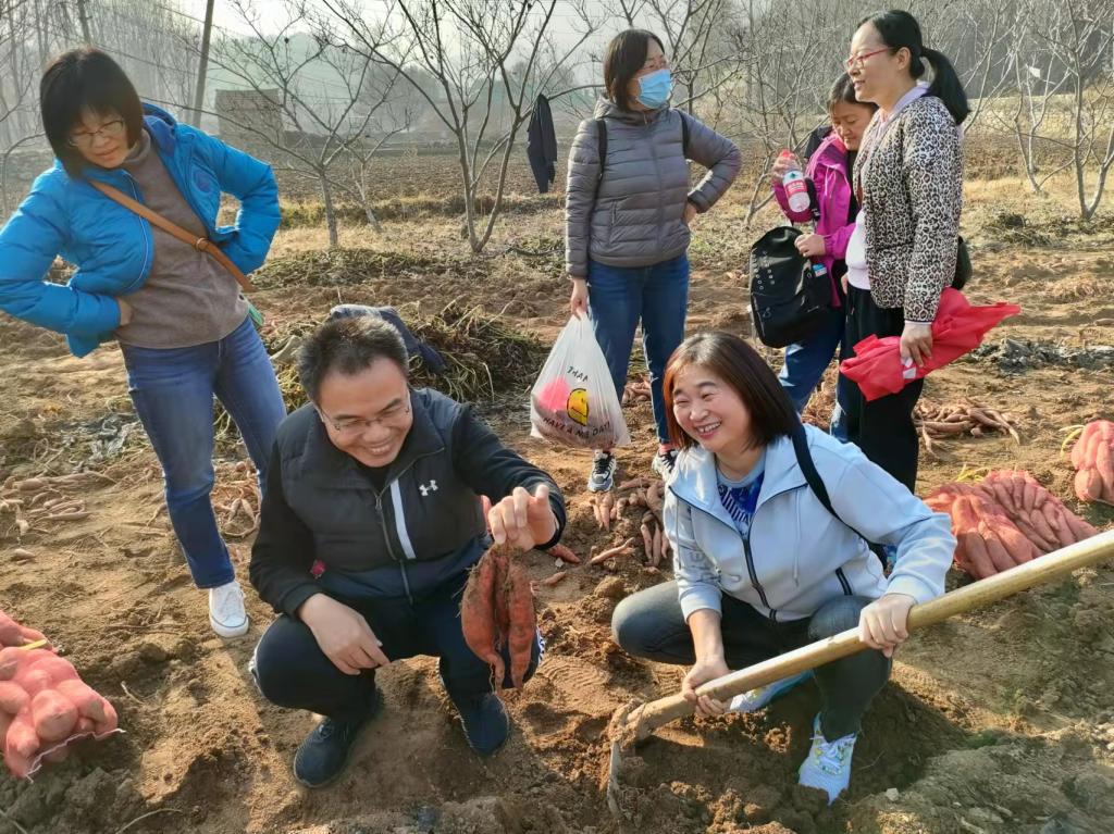 教职工们来到农田,就看到大片的蜜薯地,乡村空气香甜清冽,沁人心脾。勤劳的村民正在秋收劳作,一派繁忙景色。蜜薯的叶子经霜枯萎,覆盖在土垄上,蜜薯就藏在叶子下面的沙土里,老师们迫不及待地簇拥着来到地里,开始采挖活动,有“单打独斗”的,有互相合作的,带孩子的教工还抓住机会现场普及植物生长知识,场面十分热闹欢乐,大家充分体验到了劳动的乐趣。