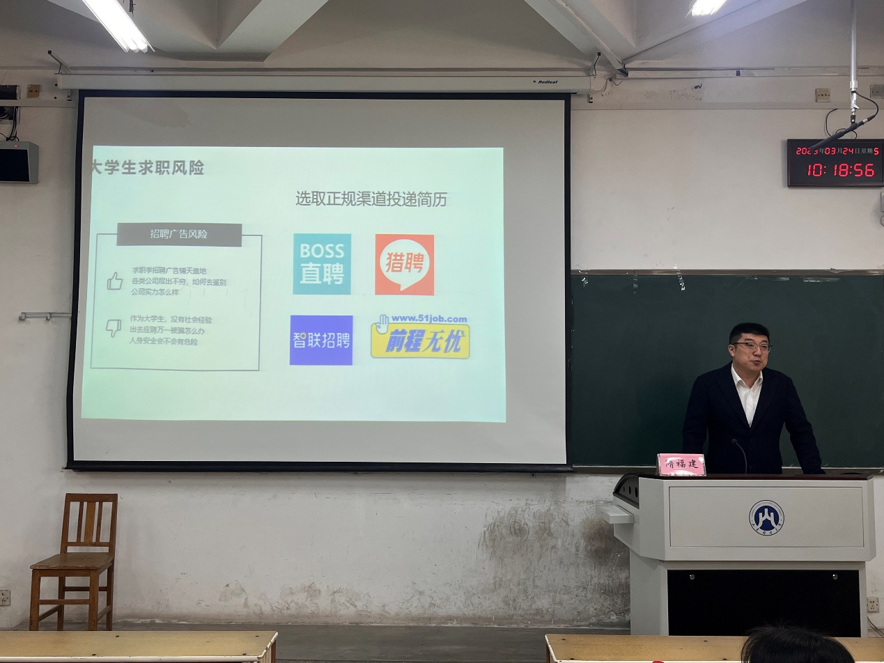 第一部分,加强风险认知。隋福建提醒同学们在求职过程中应当注意四个风险:一是老员工求职风险,应选取正规渠道投递简历;二是关注企业信用风险,通过企查查等了解企业信用状况;三是隐私泄露风险,可办理求职专用手机号等避免隐私泄露;四是合同用工风险,求职过程中应当诚实守信、有契约精神。